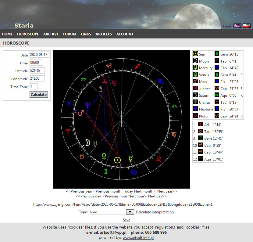 Below, the "ZyJanGi" horoscope is opened on the "Staria.pl" website